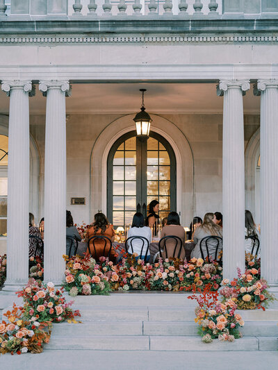includes Italian-Revival style columns, limestone facade, and terracotta tile details. Below the Mediterranean-inspired design, the sun-lit, lush lawn serves as a perfect backdrop for your ceremony.